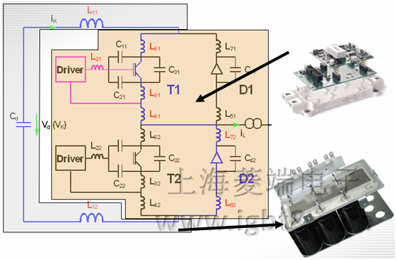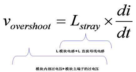 通過設計低電感的直流環(huán)節(jié)(較小的Lstray),可以使過電壓顯著減小。