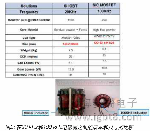 在Si-IGBT已經(jīng)被切換為20 kHz。CREE MOSFET的開關(guān)頻率為100 kHz。很明顯,在Vgs=18V/-2V和Vgs=15V/-2V條件下,C2M0080120D比Si-IGBT實(shí)現(xiàn)了更好的效率。
