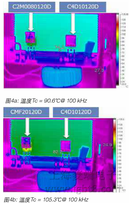 此外,在相同轉(zhuǎn)換器中比較了競爭者的SiC-MOSFET。在6d圖像中可以看出結(jié)果。C2M0080120D比CWIF20120D冷了15℃,比競爭對手的SiC-MOSFET冷了近38'C。實(shí)際上CMF20120D溫度低了約13C。