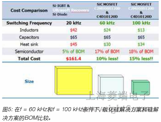 現(xiàn)在比較BOM時(shí),下列事實(shí)可以成立.雖然功率半導(dǎo)體的百分比只有硅基解決方案的5%,但最終整體成本較高。其中一個原因是由于較高的頻率可以減少電感,另一個原因是開關(guān)損耗相當(dāng)?shù),因此在SiC-MOSFET的情況下有更好的熱成像,從而有可能減少散熱器的大小和成本。如果開關(guān)頻率提高到f= 100 kHz,碳化硅基解決方案的BOM成本可以降低5%。顯著減少的整個系統(tǒng)的尺寸和重量也必須考慮在內(nèi)。